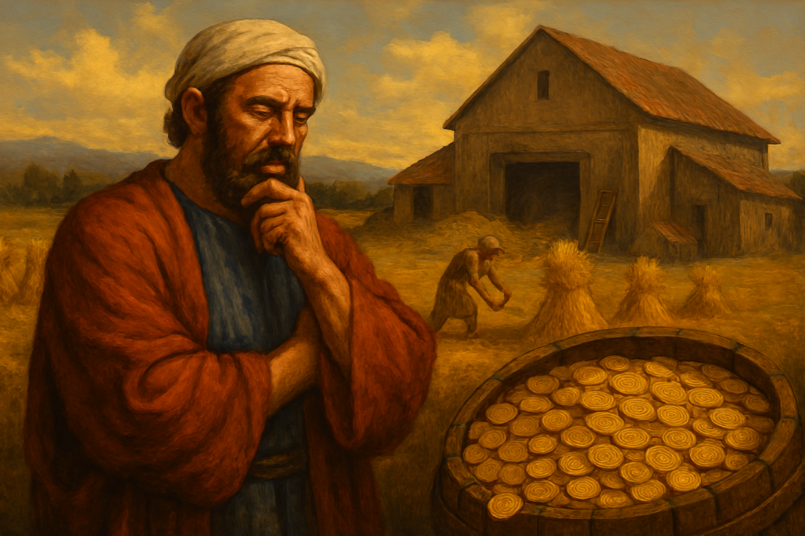 Jesus then tells the parable of a rich farmer who receives an abundant harvest. Instead of sharing or thanking God, the man builds bigger barns to store everything for himself, planning to relax and enjoy life for many years. But God calls him a fool, because that very night his life ends, and all his possessions are left behind.