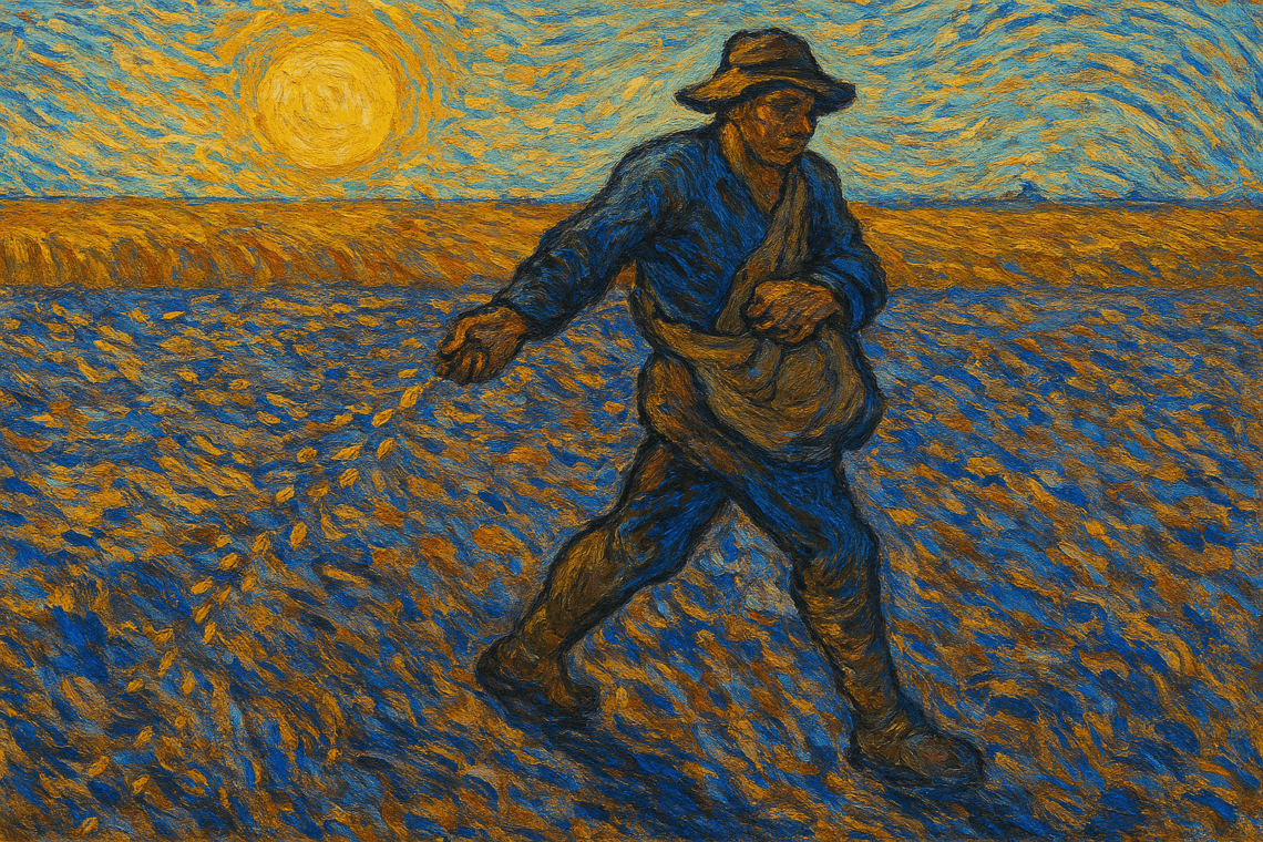 Lignelsen om såmannen 4 Mye folk strømmet nå til fra byene omkring. Da en stor mengde hadde samlet seg om ham, fortalte han en lignelse: 5 «En såmann gikk ut for å så kornet sitt. Og da han sådde, falt noe ved veien. Det ble tråkket ned, og fuglene under himmelen kom og spiste det opp. 6 Noe falt på steingrunn, og det visnet straks det kom opp, fordi det ikke fikk væte. 7 Noe falt blant tornebusker, og tornebuskene vokste opp sammen med det og kvalte det. 8 Men noe falt i god jord, og det vokste opp og bar frukt, hele hundre ganger det som ble sådd.» Da…