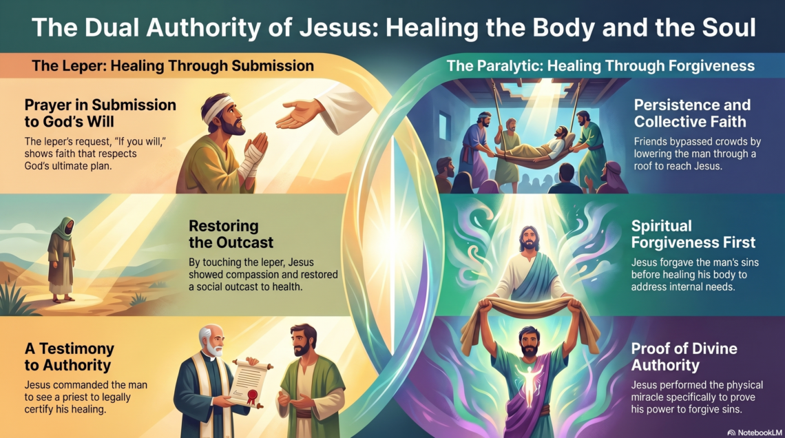 Jesus helbreder en spedalsk 12 Da han var i en av byene, kom en mann som var full av spedalskhet. Da han så Jesus, falt han ned på sitt ansikt og tryglet ham: «Herre, om du vil, kan du gjøre meg ren.»13 Jesus rakte ut hånden, rørte ved ham og sa: «Jeg vil; bli ren!» Og straks forsvant spedalskheten fra ham.14 Han bød ham å ikke fortelle det til noen, men sa: «Gå og vis deg for presten og bær fram et offer for din renselse, slik som Moses har påbudt, til et vitnesbyrd for dem.»15 Men ryktet om ham spredte seg enda mer, og store folkemengder kom for å…