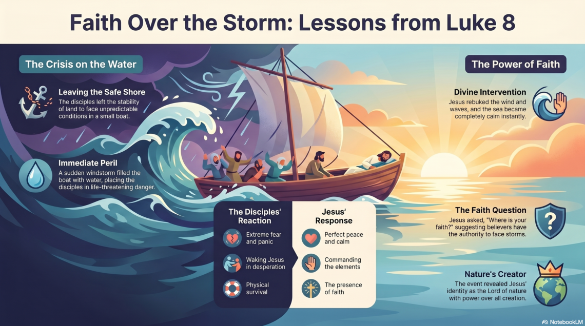 22 En dag gikk han om bord i en båt sammen med disiplene sine, og han sa til dem: «La oss dra over til den andre siden av sjøen.» Så la de ut.23 Mens de seilte, sovnet han. Da kom det en kraftig storm over sjøen, og båten begynte å fylles med vann, så de var i fare.24 Da gikk de bort og vekket ham og sa: «Mester, Mester, vi går under!» Han våknet, truet vinden og bølgene, og de la seg, og det ble blikk stille.25 Så sa han til dem: «Hvor er deres tro?» De ble grepet av frykt og undring og sa til hverandre: «Hvem er han,…