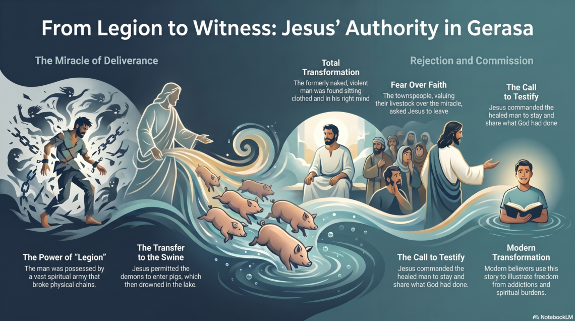Jesus helbreder en besatt 26 Så seilte de over til gerasenernes land, som ligger rett overfor Galilea.27 Da Jesus steg i land, kom det en mann fra byen som var besatt av onde ånder, og møtte ham. Han hadde ikke hatt klær på seg på lang tid og bodde ikke i hus, men holdt til i gravhulene.28 Da han fikk se Jesus, skrek han høyt, kastet seg ned for ham og ropte: «Hva har du med meg å gjøre, Jesus, du Den høyeste Guds Sønn? Jeg ber deg: Ikke plag meg!»29 For Jesus hadde befalt den urene ånden å fare ut av mannen. Mange ganger hadde den grepet ham, og…