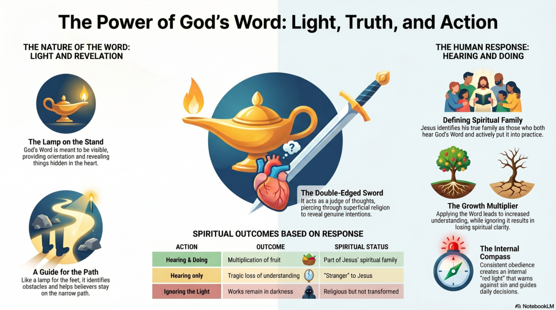16 «Ingen tenner en lampe og gjemmer den i en krukke eller setter den under en seng. Nei, man setter den på en holder, så de som kommer inn, kan se lyset.17 For ingenting er skjult som ikke skal bli avslørt, og ingenting er hemmelig som ikke skal bli kjent og komme for dagen.18 Vær derfor oppmerksomme på hvordan dere lytter! For den som har, skal få mer. Men den som ikke har, skal bli fratatt selv det han tror han har.» Jesu mor og brødre 19 Moren og brødrene til Jesus kom for å møte ham, men de klarte ikke å komme fram til ham på grunn av folkemengden.20…